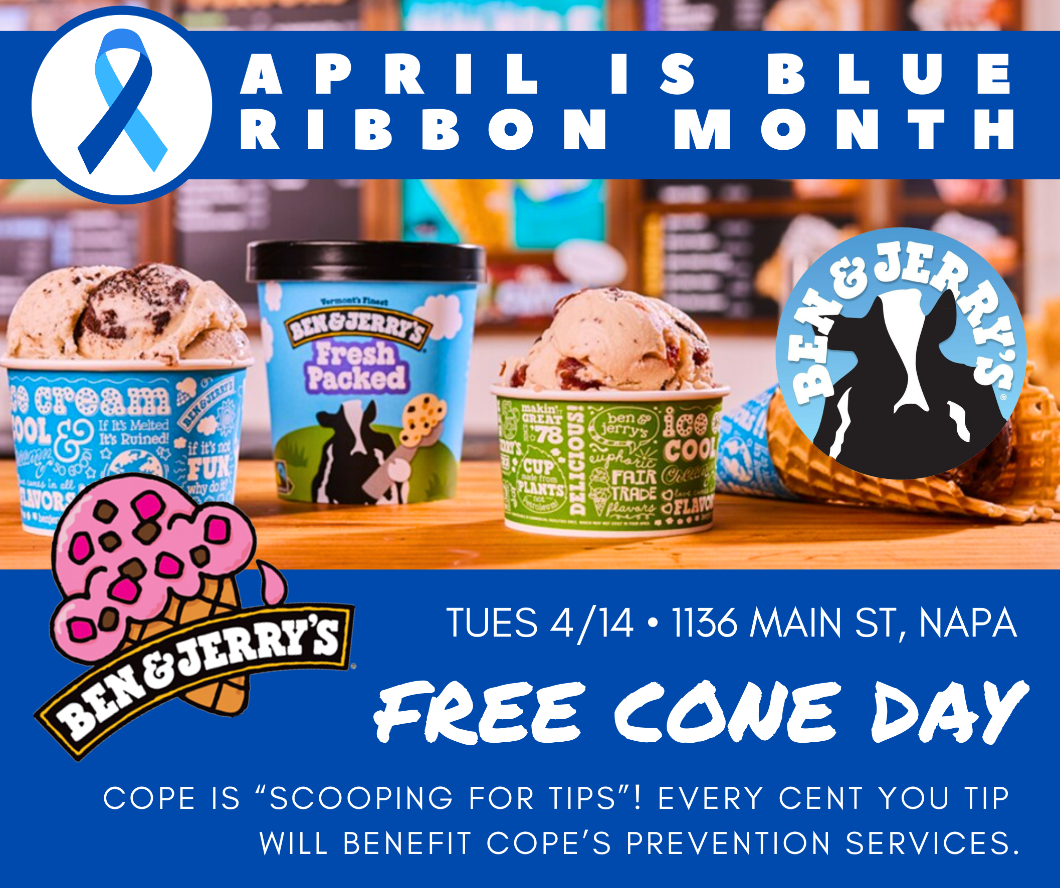 Cope will be “scooping for tips” from noon-8pm, so stop by for a frosty treat, and make sure to tip your server! Every cent you tip will benefit Cope’s family strengthening and prevention services.